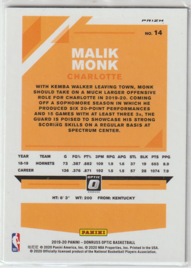 14 Malik Monk - Charlotte Hornets Blue Velocity 2019/20 Donruss Optic Basketball