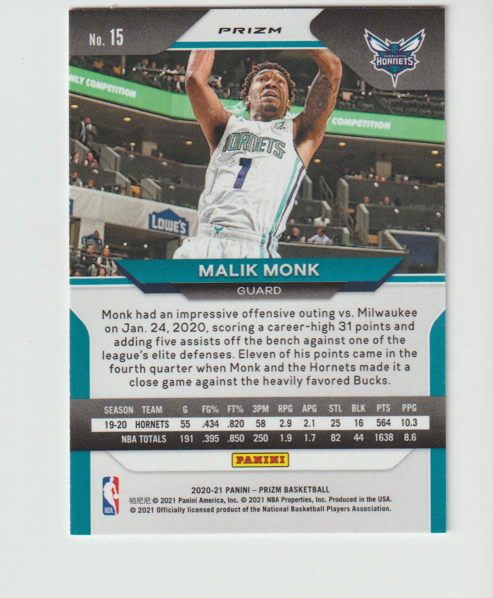 15 Malik Monk - Charlotte Hornets Silver Prizm 2020/21 Prizm Basketball