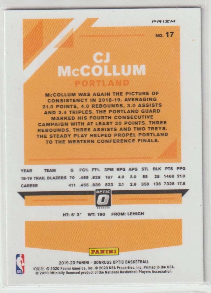 17 CJ McCollum - Portland Trail Blazers Hyper Pink Prizm 2019/20 Donruss Optic Basketball