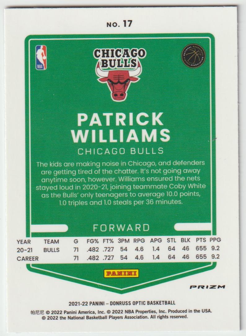 17 Patrick Williams - Chicago Bulls Purple 2021/22 Donruss Optic Basketball