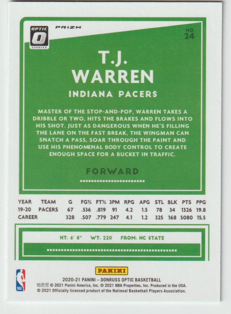 24 T.J. Warren - Indiana Pacers Blue Velocity 2020/21 Donruss Optic Basketball