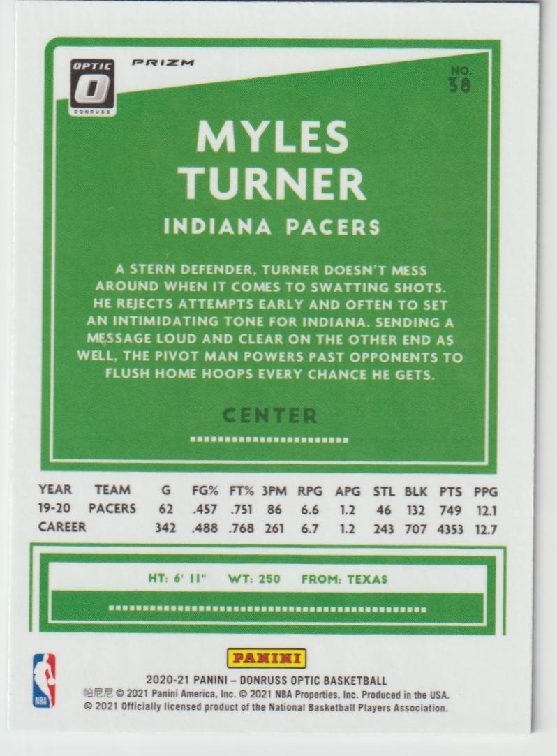 38 Myles Turner - Indiana Pacers Blue Velocity 2020/21 Donruss Optic Basketball