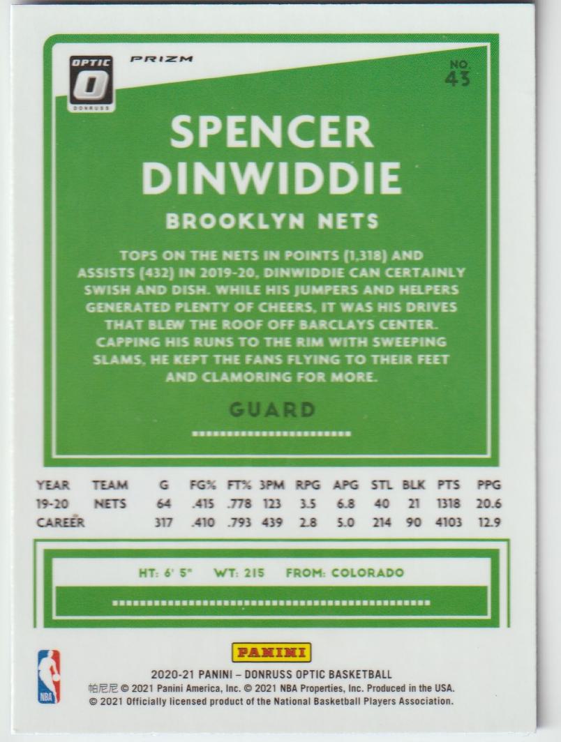 43 Spencer Dinwiddie - Brooklyn Nets Blue Velocity 2020/21 Donruss Optic Basketball