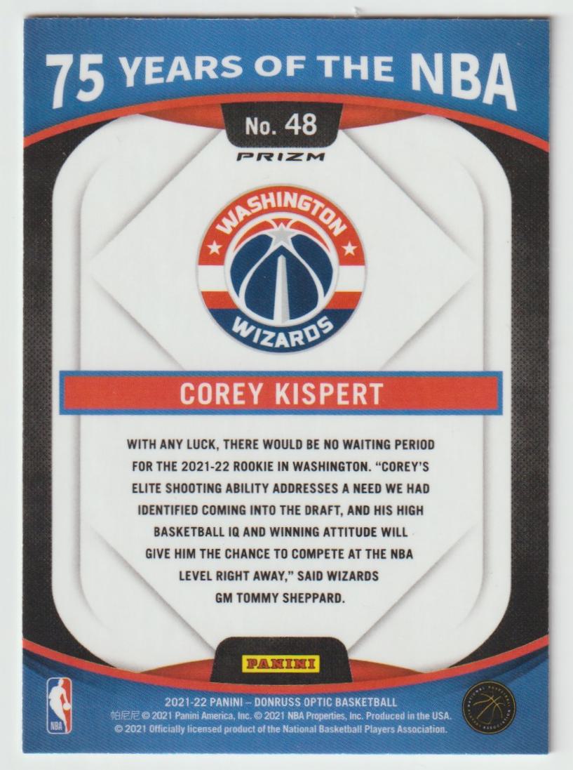 48 Corey Kispert - Washington Wizards 75 Years of the NBA 2021/22 Donruss Optic Basketball