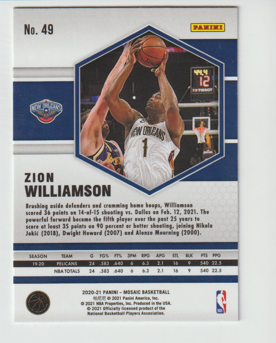49 Zion Williamson - New Orleans Pelicans 2020/21 Mosaic Basketball