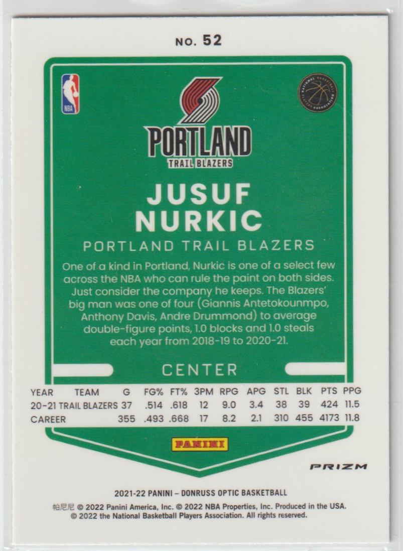52 Jusuf Nurkic - Portland Trail Blazers Purple 2021/22 Donruss Optic Basketball