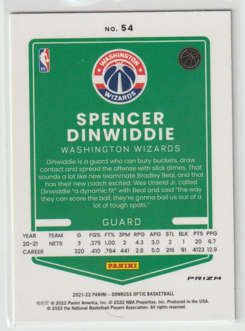 54 Spencer Dinwiddie - Washington Wizards Purple 2021/22 Donruss Optic Basketball