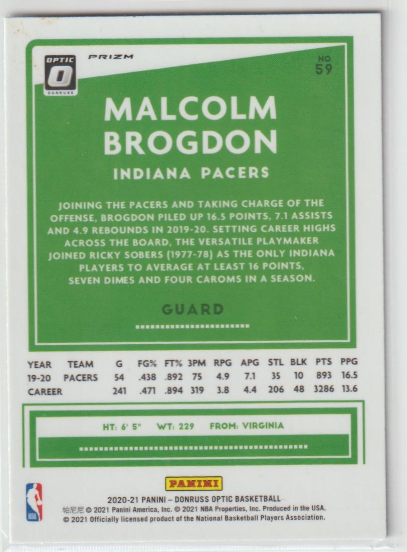 59 Malcolm Brogdon - Indiana Pacers Blue Velocity 2020/21 Donruss Optic Basketball