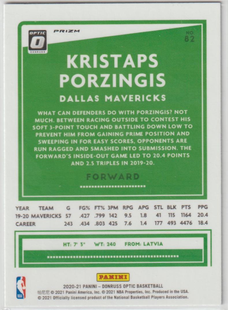 82 Kristaps Porzingis - Dallas Mavericks Purple 2020/21 Donruss Optic Basketball