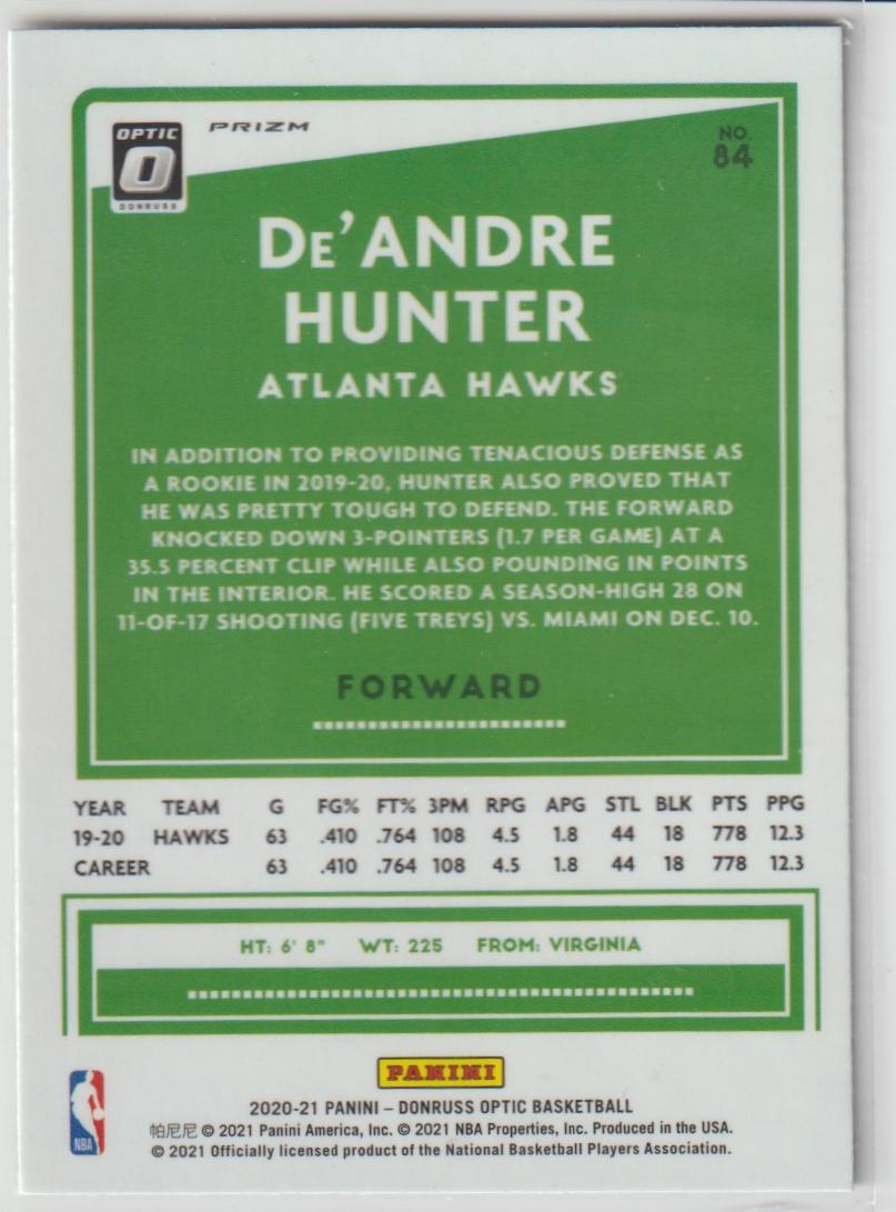 84 De'Andre Hunter - Atlanta Hawks Purple 2020/21 Donruss Optic Basketball