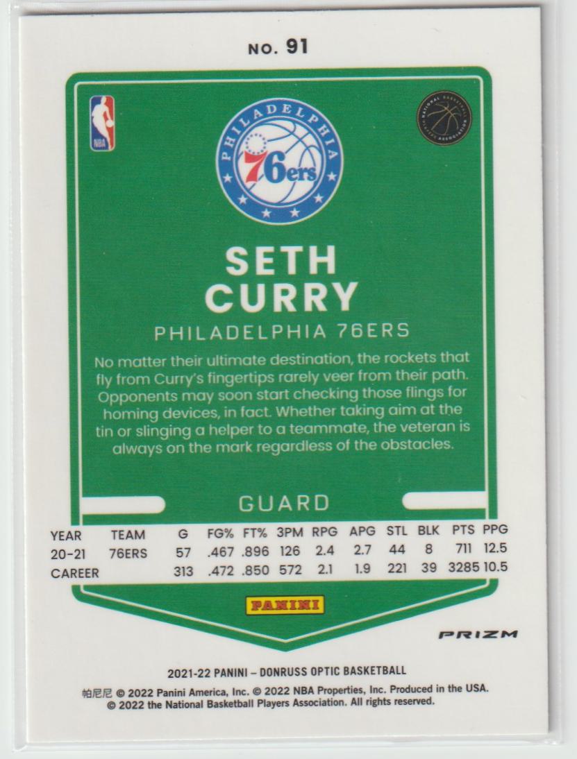 91 Seth Curry - Philadelphia 76ers Holo 2021/22 Donruss Optic Basketball