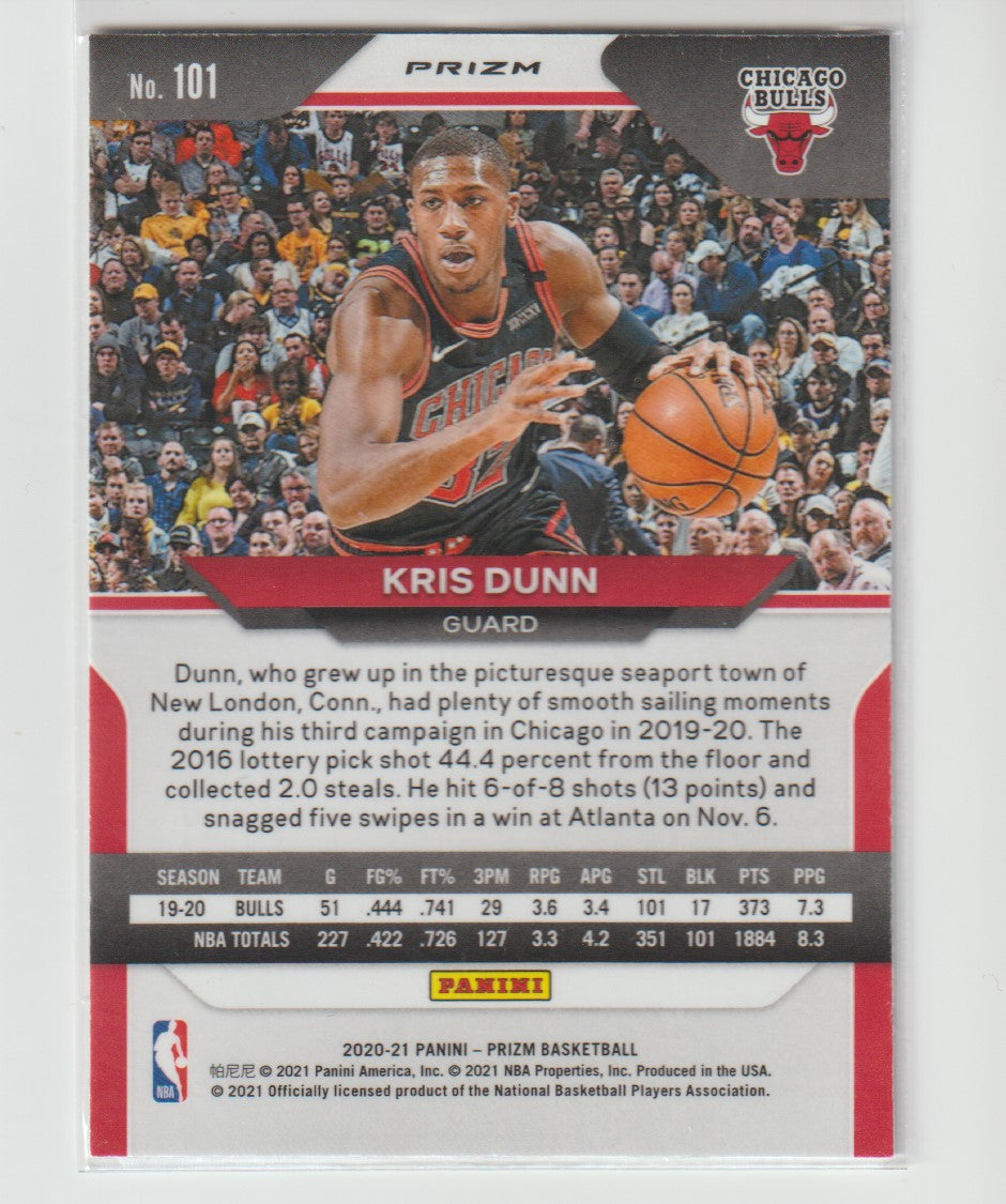 101 Kris Dunn - Chicago Bulls Silver Prizm 2020/21 Prizm Basketball