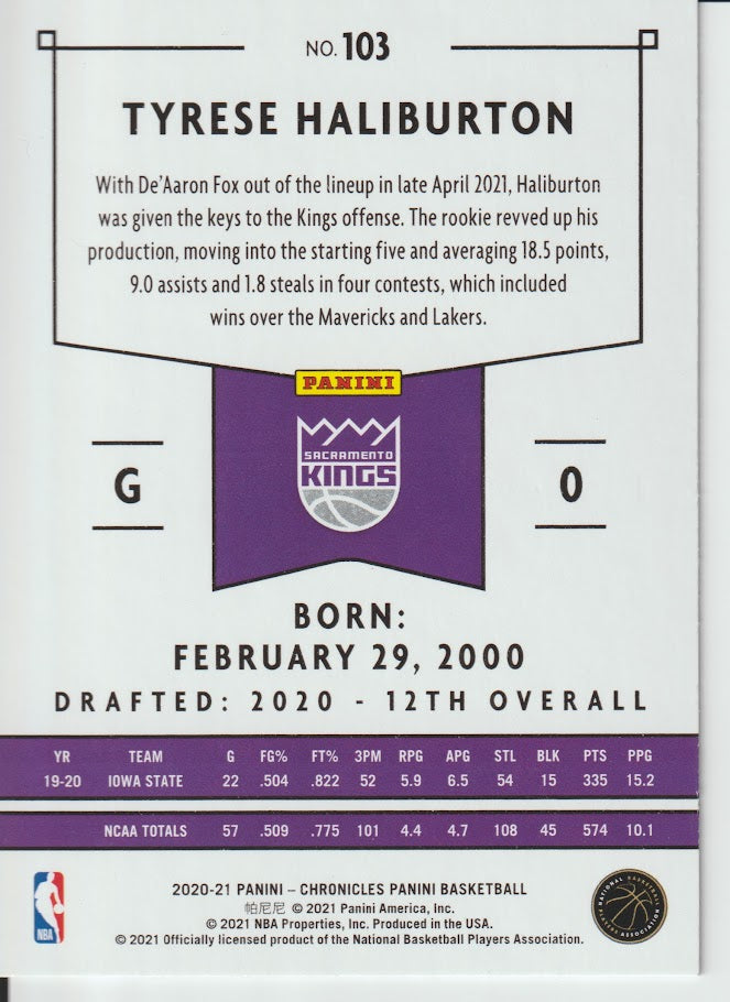 103 Tyrese Haliburton - Sacramento Kings 20/21 Chronicles Basketball