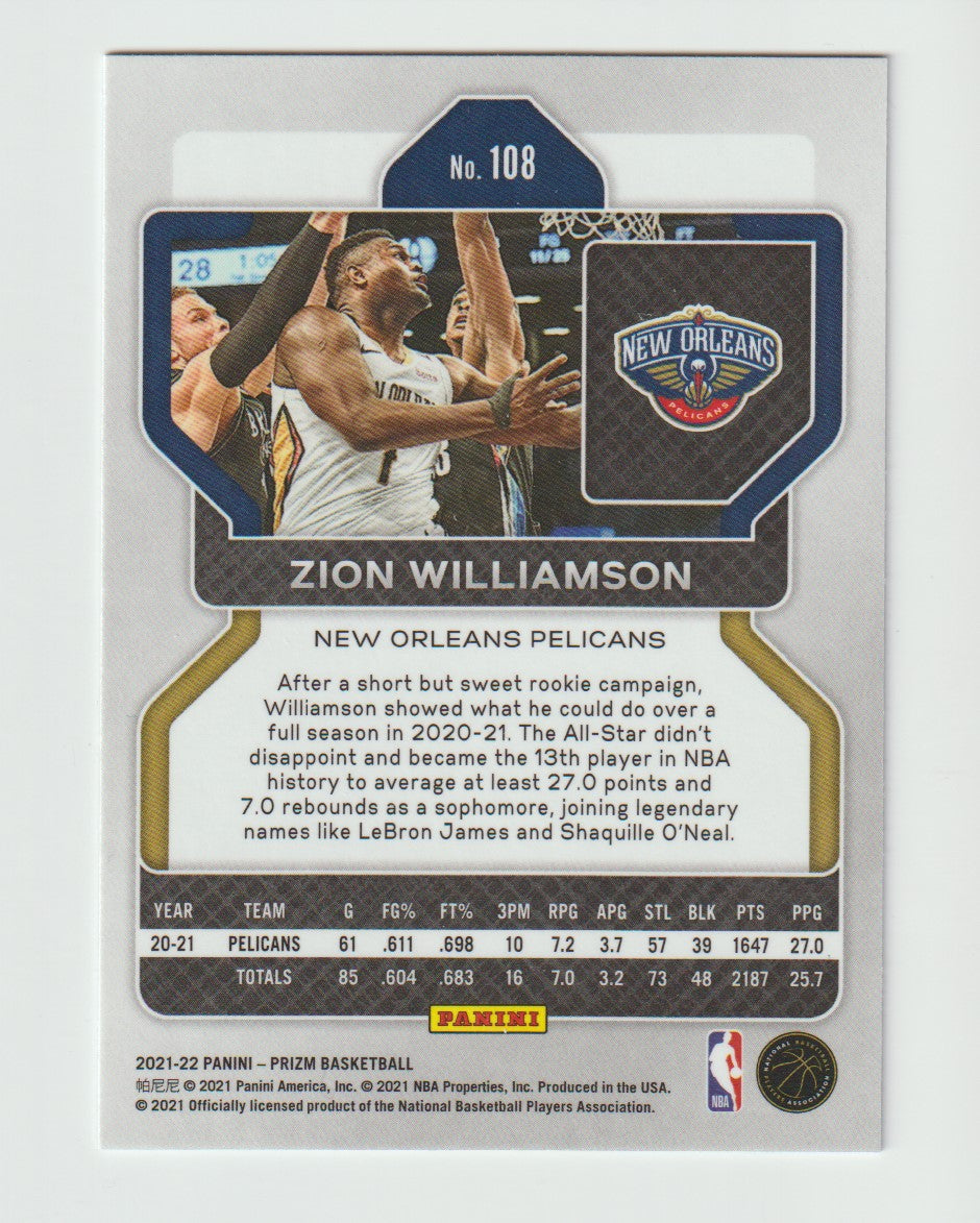 108 Zion Williamson - New Orleans Pelicans 2021/22 Prizm Basketball