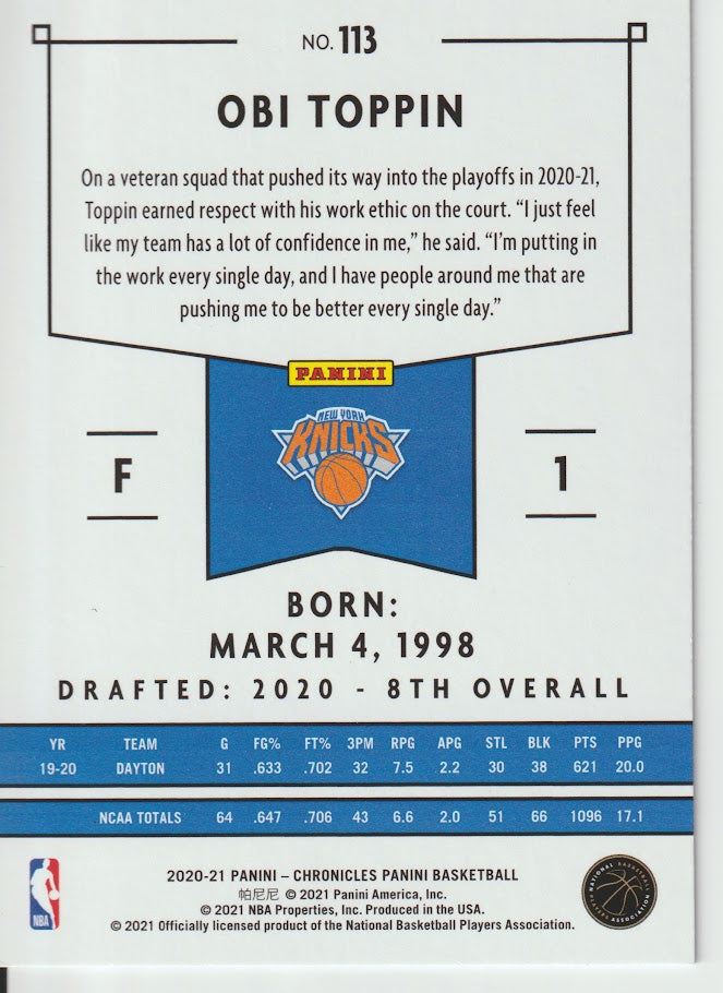 113 Obi Toppin - New York Knicks 20/21 Chronicles Basketball