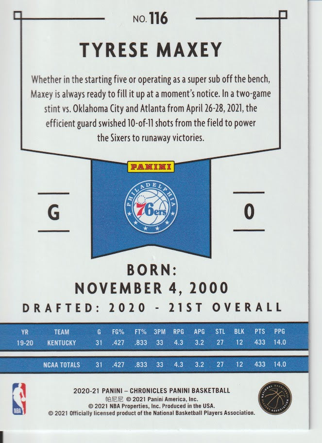 116 Tyrese Maxey - Philadelphia 76ers 20/21 Chronicles Basketball