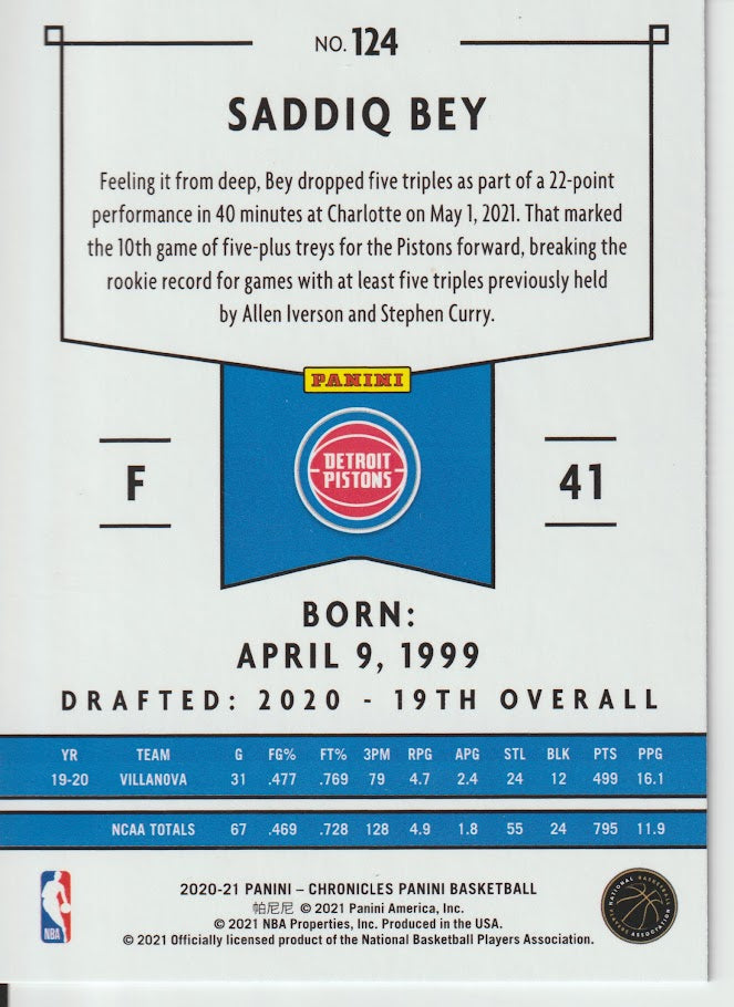 124 Saddiq Bey - Detroit Pistons 20/21 Chronicles Basketball