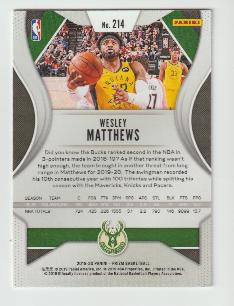 214 Wesley Matthews - Milwaukee Bucks 2019/20 Prizm Basketball