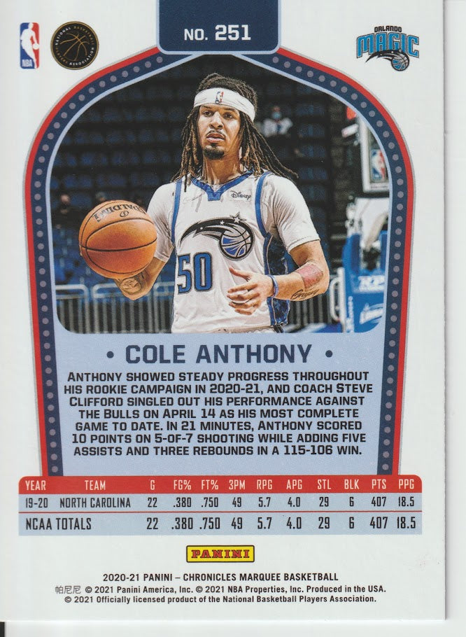251 Cole Anthony - Orlando Magic 20/21 Chronicles Basketball