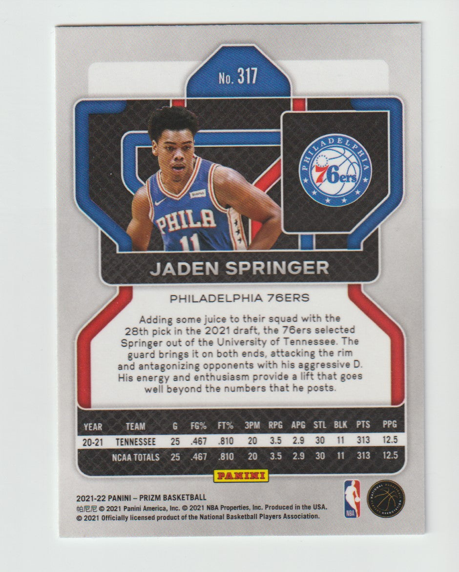 317 Jaden Springer - Philadelphia 76ers 2021/22 Prizm Basketball