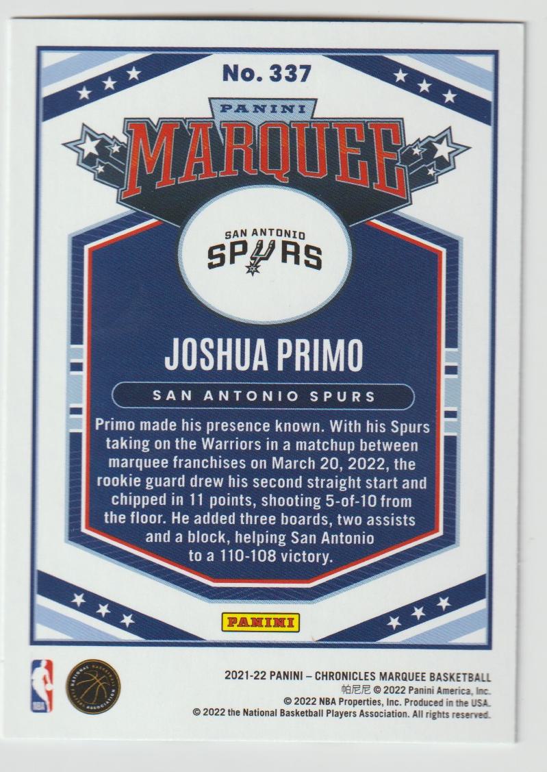 337 Joshua Primo - San Antonio Spurs 2021/22 Chronicles Basketball
