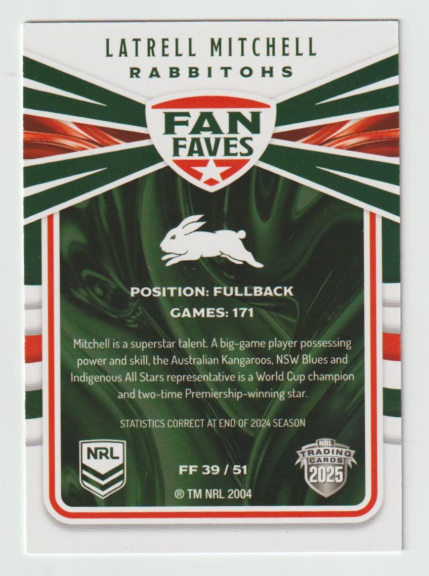Fan Faves FF 39 RABBITOHS LATRELL MITCHELL 2025 NRL Traders We prioritize the safe delivery of your sports cards. Each item will be securely packaged in a padded mailer to ensure it reaches you in pristine condition. Please be aware that our standard letter with tracking option includes a registered padded mailer for added security. Take advantage of our combined postage offer for multiple card purchases, or opt for tracked postage, available for both Australian and international buyers at their expense.