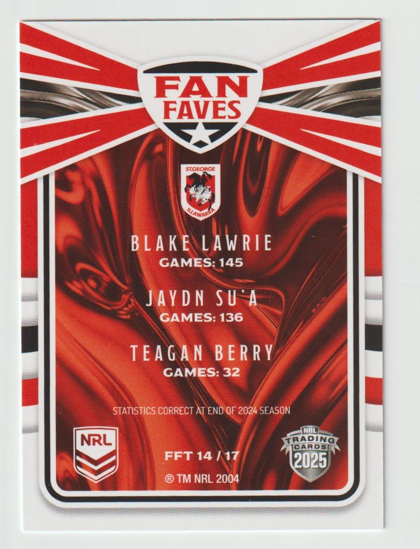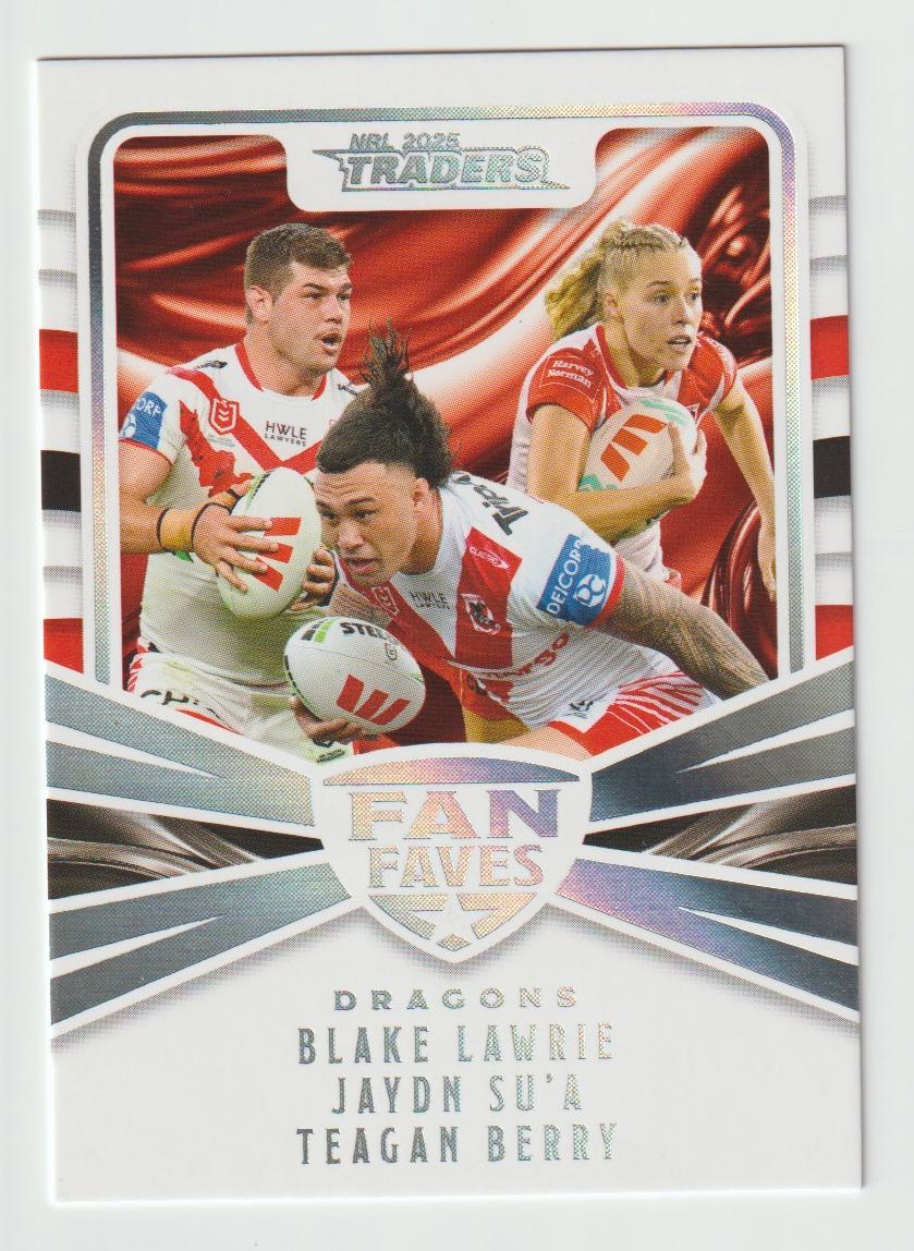Fan Faves Teams FFT 14 DRAGONS 2025 NRL Traders We prioritize the safe delivery of your sports cards. Each item will be securely packaged in a padded mailer to ensure it reaches you in pristine condition. Please be aware that our standard letter with tracking option includes a registered padded mailer for added security. Take advantage of our combined postage offer for multiple card purchases, or opt for tracked postage, available for both Australian and international buyers at their expense.