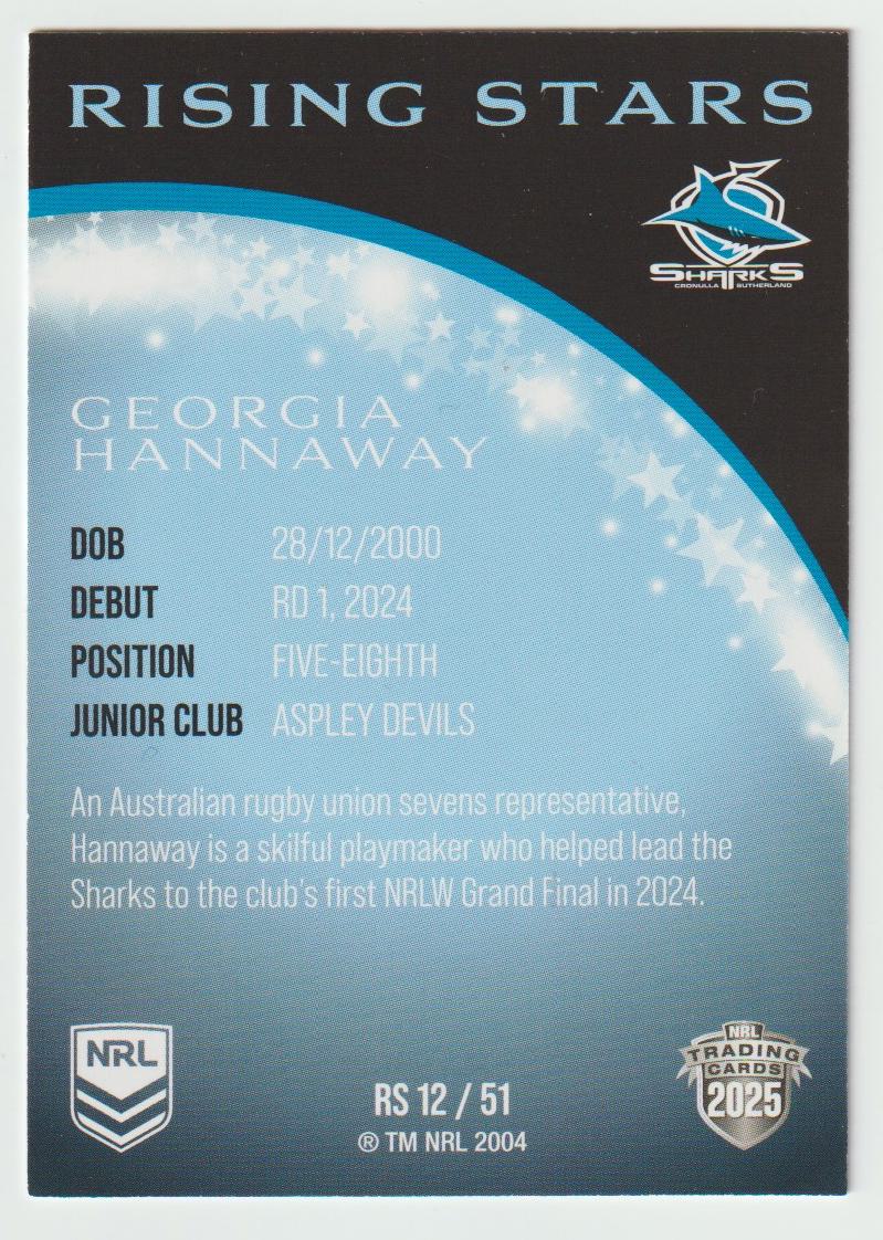 Rising Stars RS 12 SHARKS GEORGIA HANNAWAY 2025 NRL Traders We prioritize the safe delivery of your sports cards. Each item will be securely packaged in a padded mailer to ensure it reaches you in pristine condition. Please be aware that our standard letter with tracking option includes a registered padded mailer for added security. Take advantage of our combined postage offer for multiple card purchases, or opt for tracked postage, available for both Australian and international buyers at their expense.
