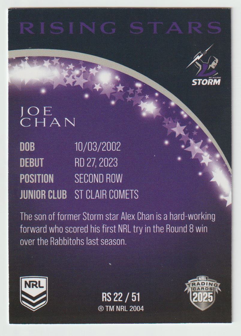 Rising Stars RS 22 STORM JOE CHAN 2025 NRL Traders We prioritize the safe delivery of your sports cards. Each item will be securely packaged in a padded mailer to ensure it reaches you in pristine condition. Please be aware that our standard letter with tracking option includes a registered padded mailer for added security. Take advantage of our combined postage offer for multiple card purchases, or opt for tracked postage, available for both Australian and international buyers at their expense.