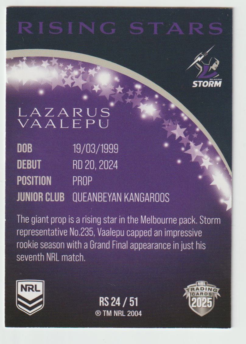 Rising Stars RS 24 STORM LAZARUS VAALEPU 2025 NRL Traders We prioritize the safe delivery of your sports cards. Each item will be securely packaged in a padded mailer to ensure it reaches you in pristine condition. Please be aware that our standard letter with tracking option includes a registered padded mailer for added security. Take advantage of our combined postage offer for multiple card purchases, or opt for tracked postage, available for both Australian and international buyers at their expense.