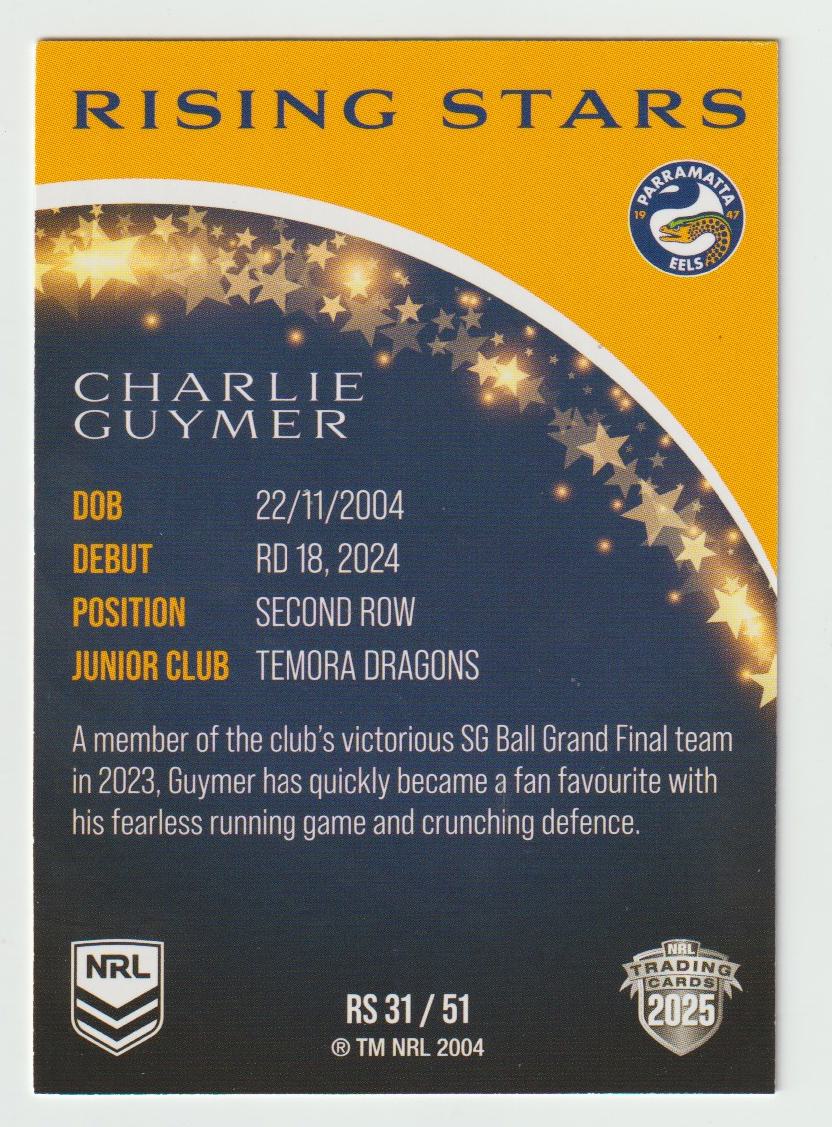 Rising Stars RS 31 EELS CHARLIE GUYMER 2025 NRL Traders We prioritize the safe delivery of your sports cards. Each item will be securely packaged in a padded mailer to ensure it reaches you in pristine condition. Please be aware that our standard letter with tracking option includes a registered padded mailer for added security. Take advantage of our combined postage offer for multiple card purchases, or opt for tracked postage, available for both Australian and international buyers at their expense.