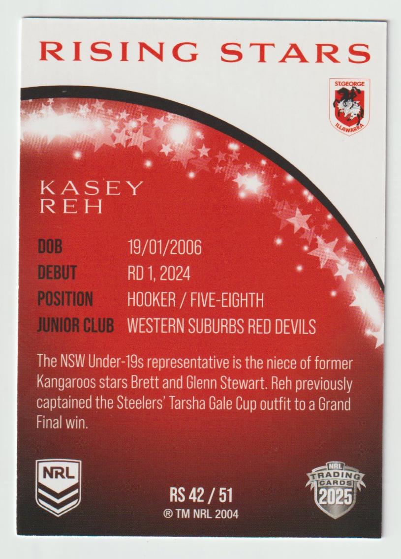 Rising Stars RS 42 DRAGONS KASEY REH 2025 NRL Traders We prioritize the safe delivery of your sports cards. Each item will be securely packaged in a padded mailer to ensure it reaches you in pristine condition. Please be aware that our standard letter with tracking option includes a registered padded mailer for added security. Take advantage of our combined postage offer for multiple card purchases, or opt for tracked postage, available for both Australian and international buyers at their expense.
