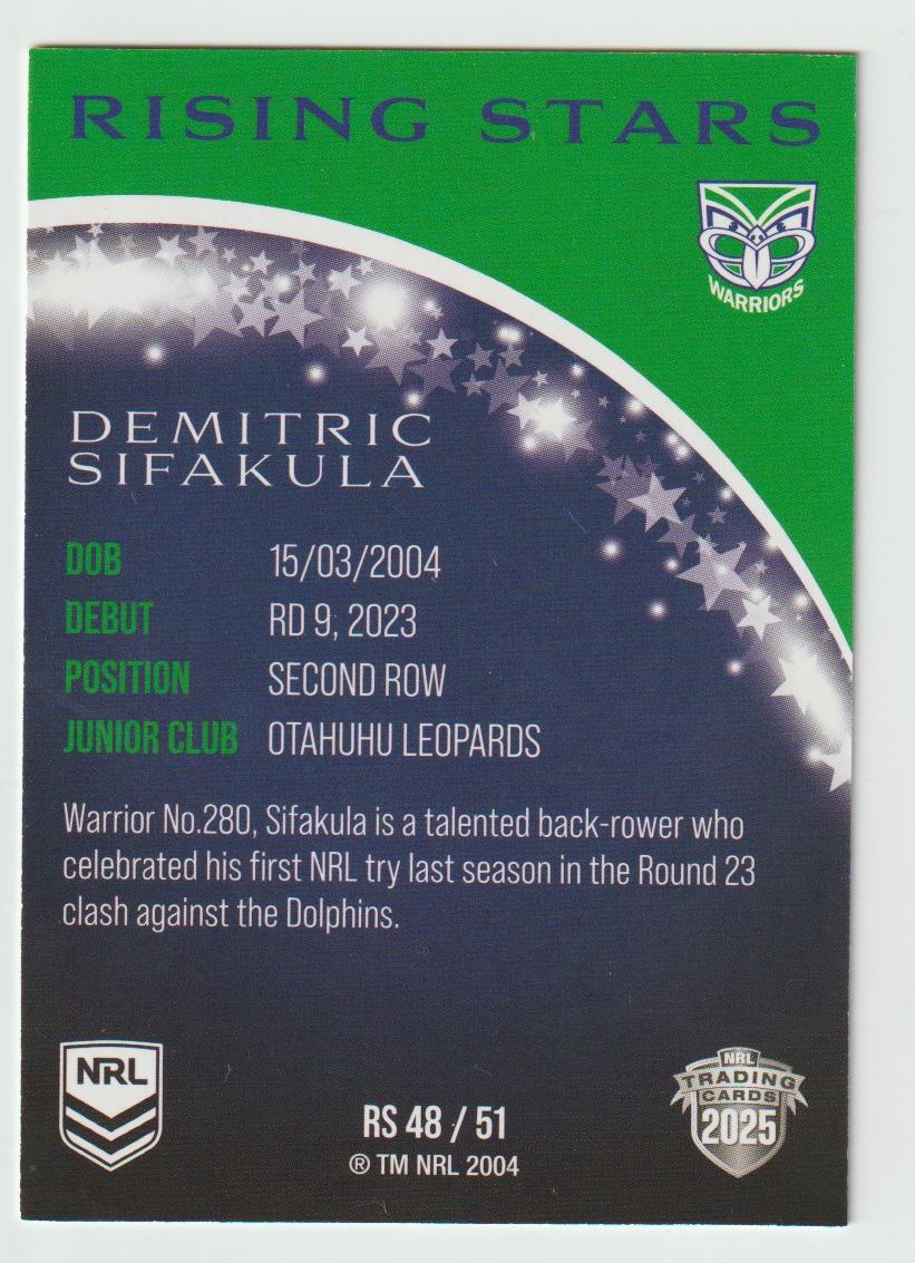 Rising Stars RS 48 WARRIORS DEMITRIC SIFAKULA 2025 NRL Traders We prioritize the safe delivery of your sports cards. Each item will be securely packaged in a padded mailer to ensure it reaches you in pristine condition. Please be aware that our standard letter with tracking option includes a registered padded mailer for added security. Take advantage of our combined postage offer for multiple card purchases, or opt for tracked postage, available for both Australian and international buyers at their expense.