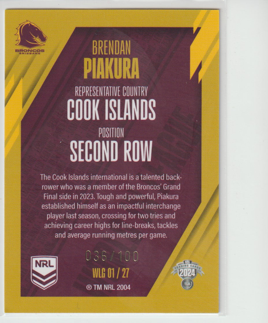 WLG 01 / 54 BRONCOS BRENDAN PIAKURA 36/100 2024 NRL Traders